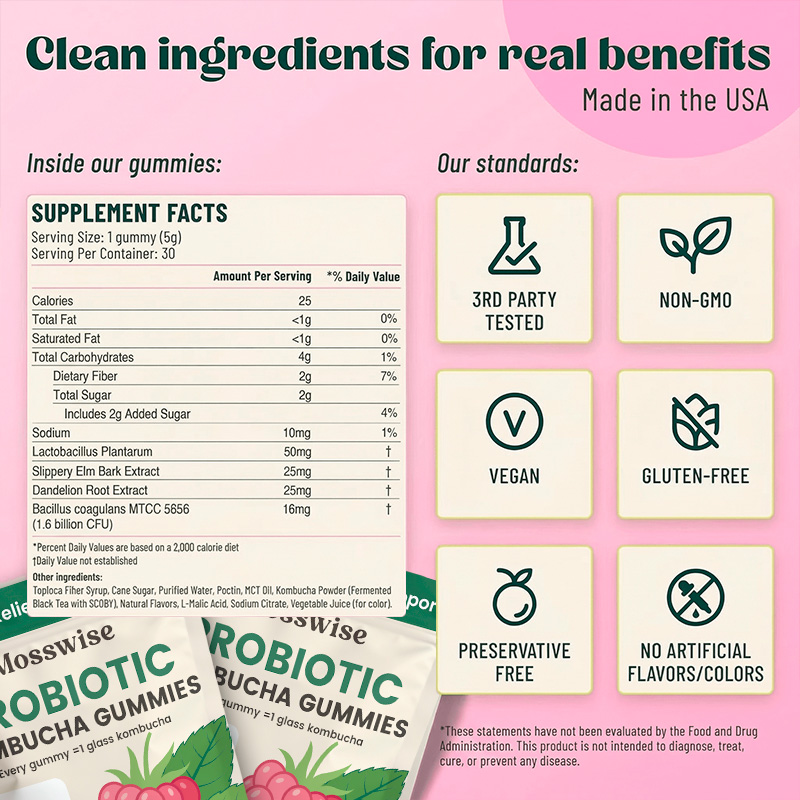 Introducing Mosswise, a unique blend of all-natural ingredients. Rapidly delivers live probiotics, prebiotics, and postbiotics through delicious kombucha gummies, rebuilding gut balance and soothing digestion. Keeps you safe from bloating and supports overall gut health!